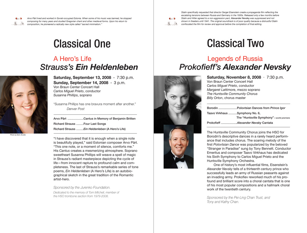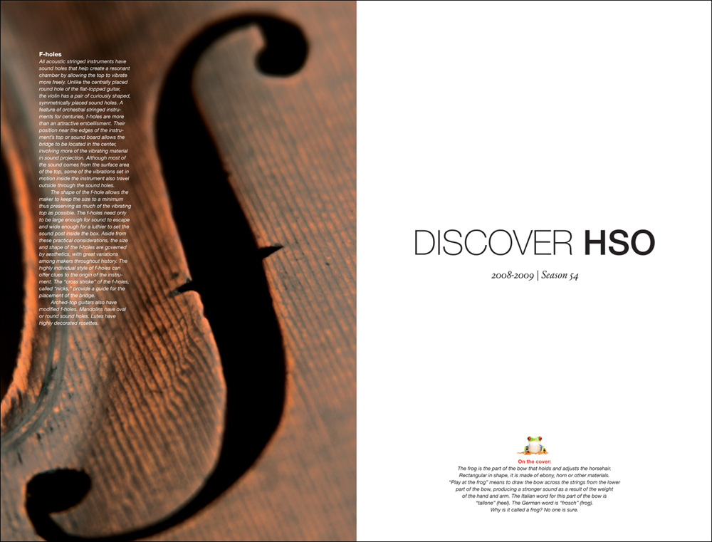 coming 08/09 concert season and interesting facts (a frog?) related to the HSO, symphony orchestras, the instruments, individual musicians and/or